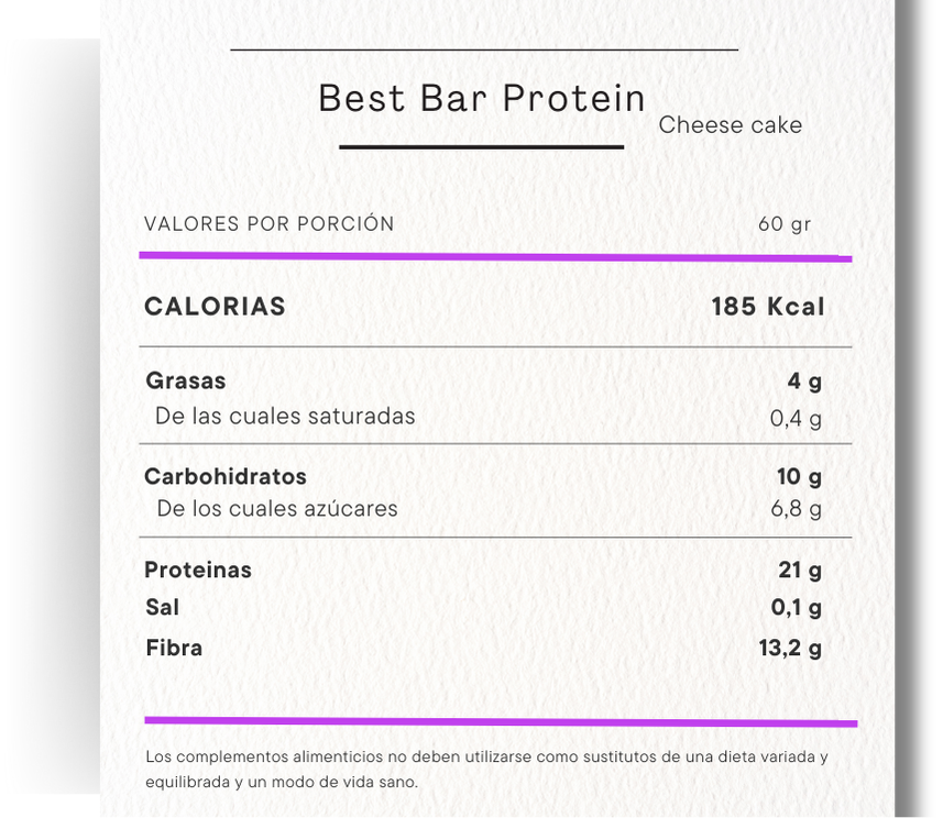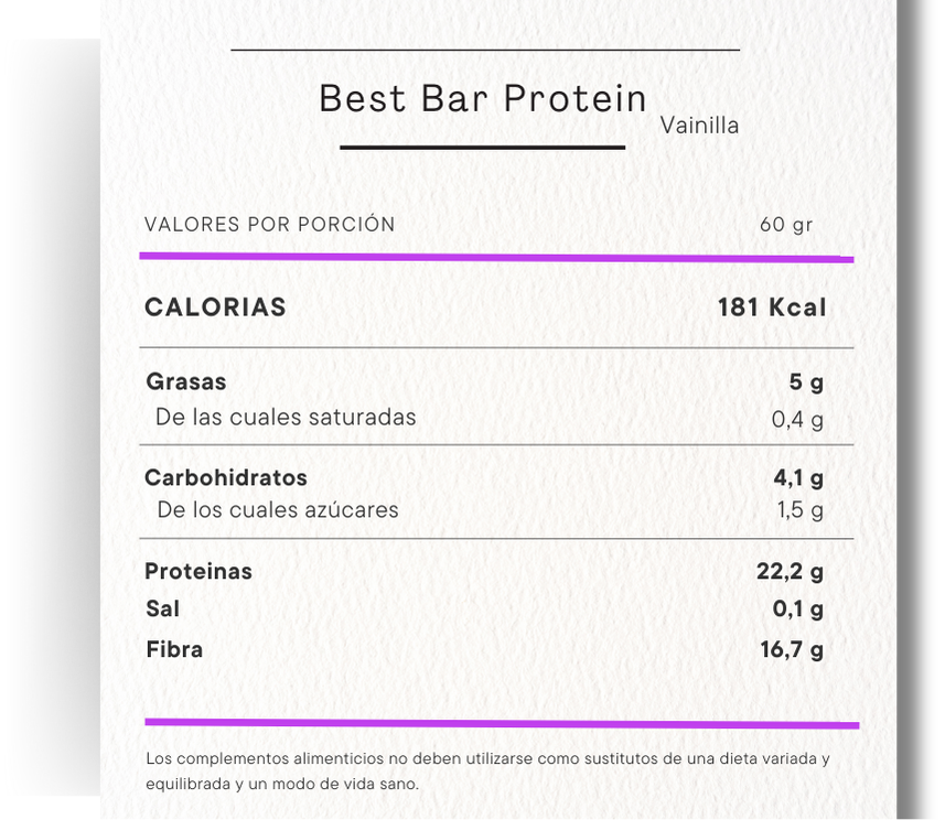 Perfecta para dietas de definición muscular, su bajo contenido en calorías y carbohidratos la convierte en la elección acertada para cualquier régimen alimenticio. Bestbar se adapta a ti, sin importar tus metas fitness o preferencias dietéticas.