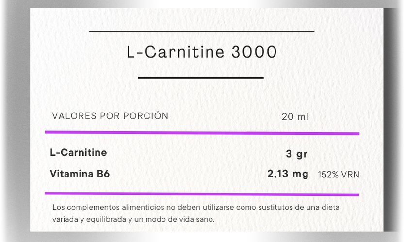INGREDIENTES: Agua Purificada, L-Carnitina Base, Glicerina, Acidulante (Ácido Cítrico), Conservantes (Benzoato Sódico y Sorbato Potásico), Aroma, Clorhidrato de Piridoxina (Vit. B6) y Edulcorante (Sacarina Sódica).