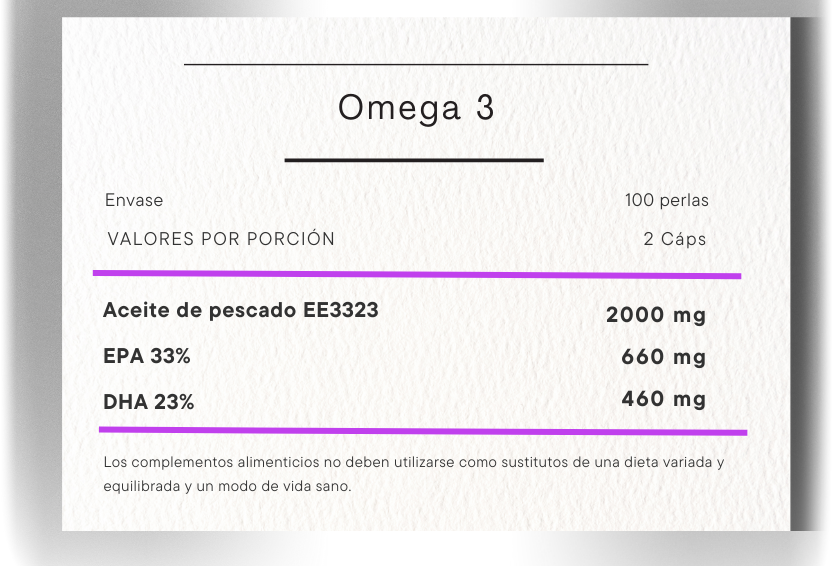 33% EPA y 23% DHA, con antioxidantes (Vit. E).