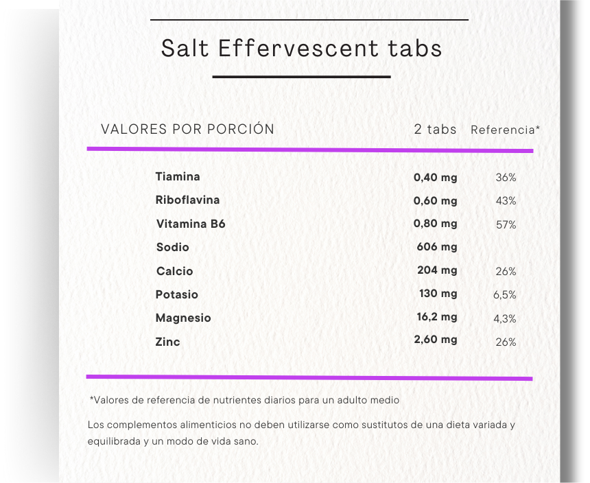 Sodio y Potasio: Durante una práctica deportiva prolongada es muy fácil perder estos electrolitos bien por el sudor, bien por otros líquidos corporales. Salt Effervescent Tabs te aporta minerales para ayudarte a prevenir el desequilibrio electrolítico y sus consecuencias más comunes.