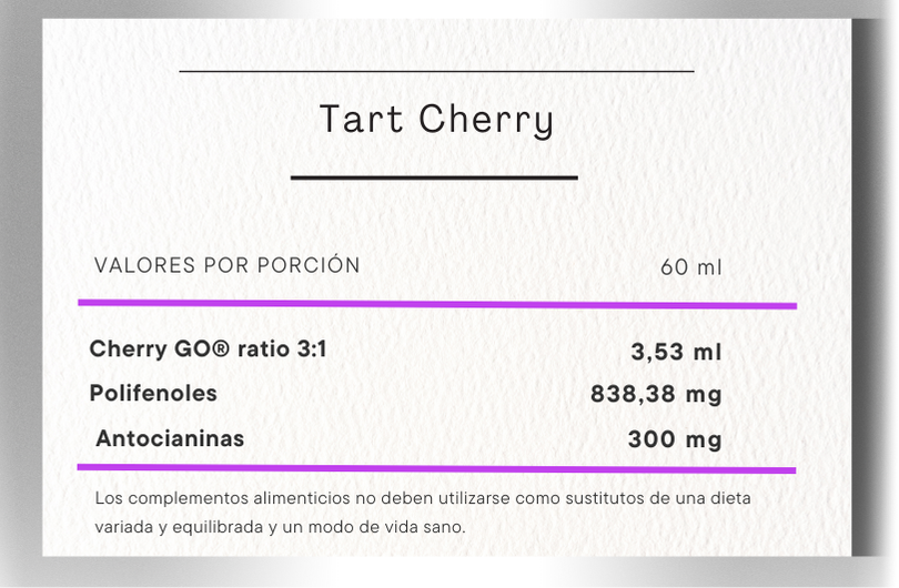 Además, gracias a su poder antiinflamatorio y antioxidante, ayudan al sistema natural de defensa del cuerpo y a la regeneración muscular. Tart Cherry puede mejorar el rendimiento en la actividad física y la recuperación muscular al combatir las especies reactivas de oxígeno (ROS) que se producen durante el esfuerzo físico y que se relacionan con la fatiga.